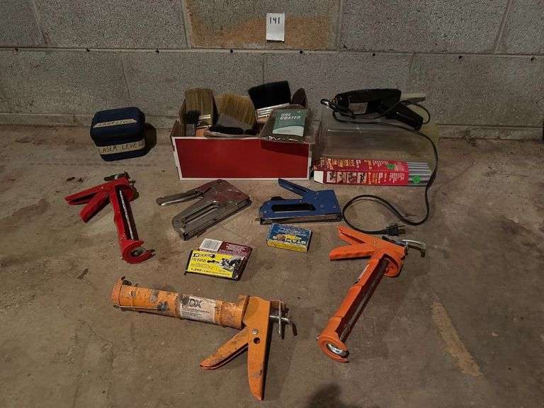 LOT 141 - Paintbrushes, Caulk Guns, Staple Guns, Laser Level, Measuring Tapes, Knives, Etc.